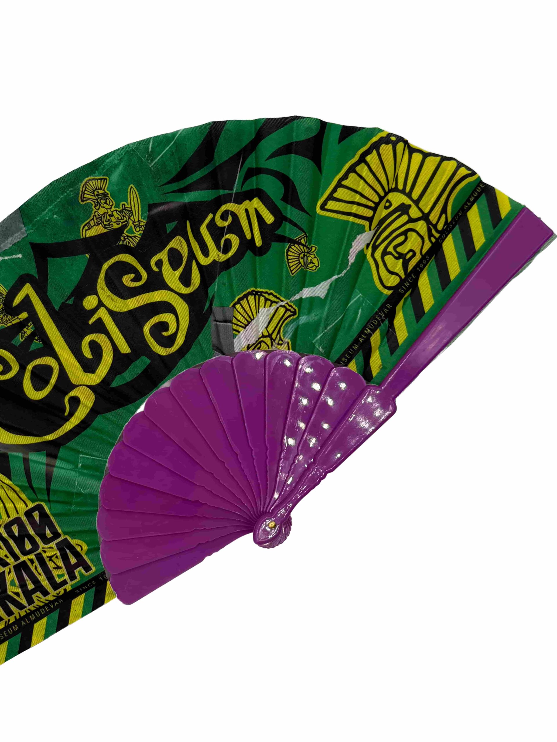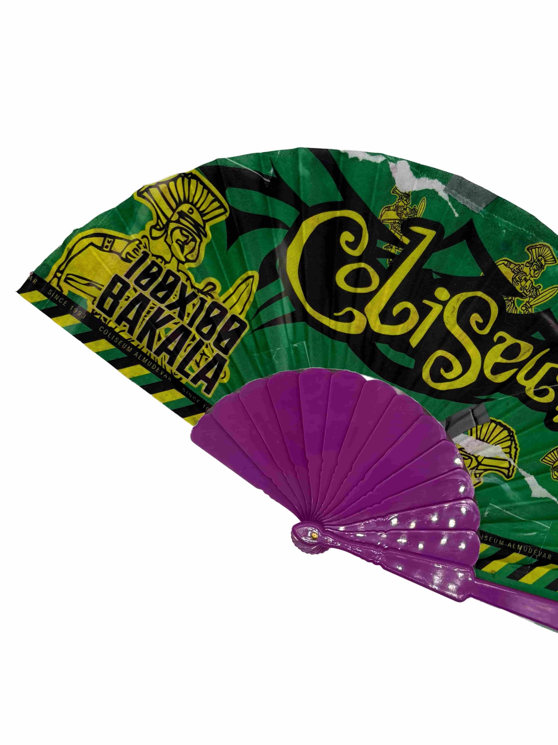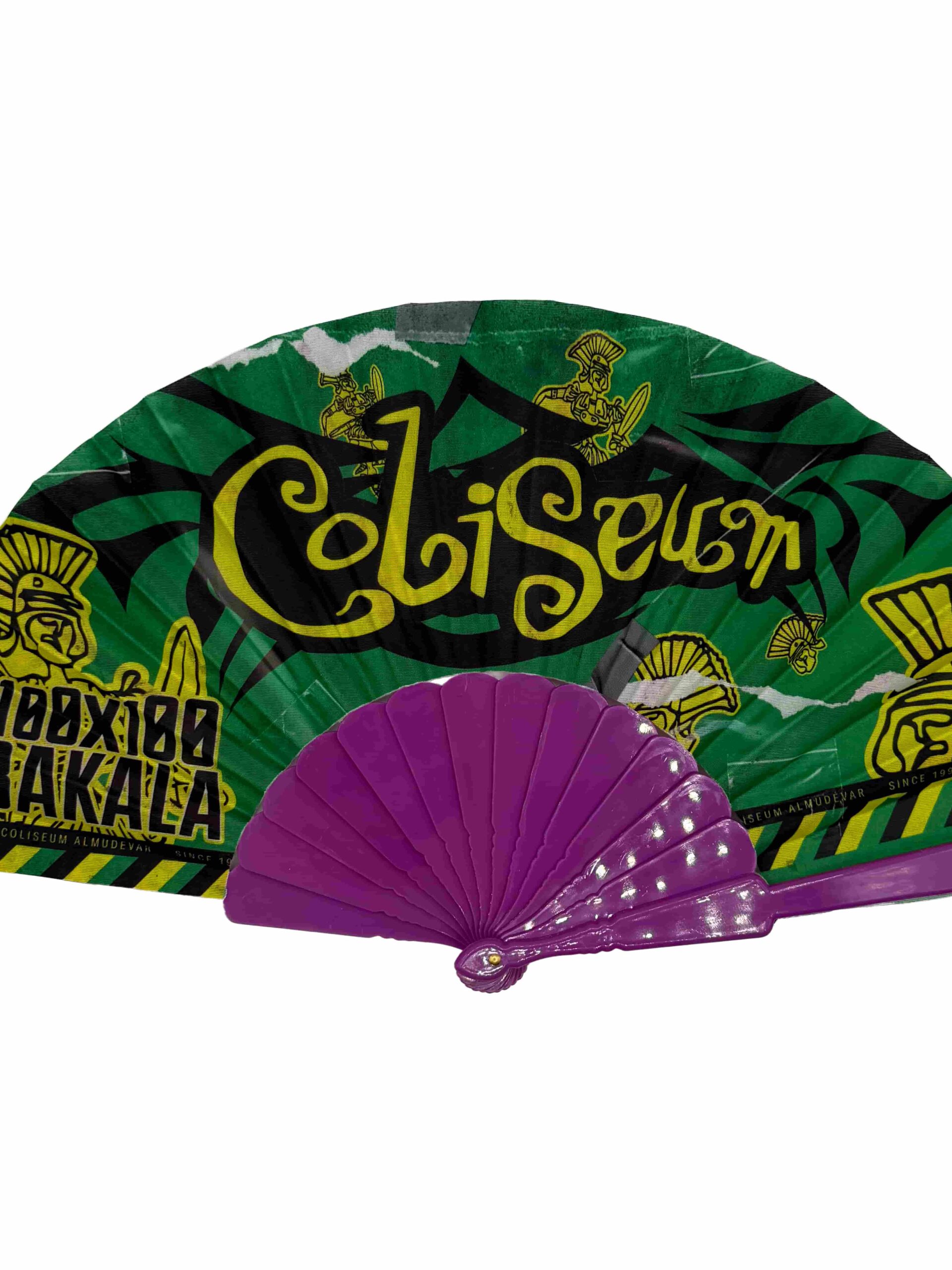 Abanico con motivo de la fiesta 100×100 Bakala. Disponible con la varilla en 3 colores diferentes: Negra, morada o amarilla.