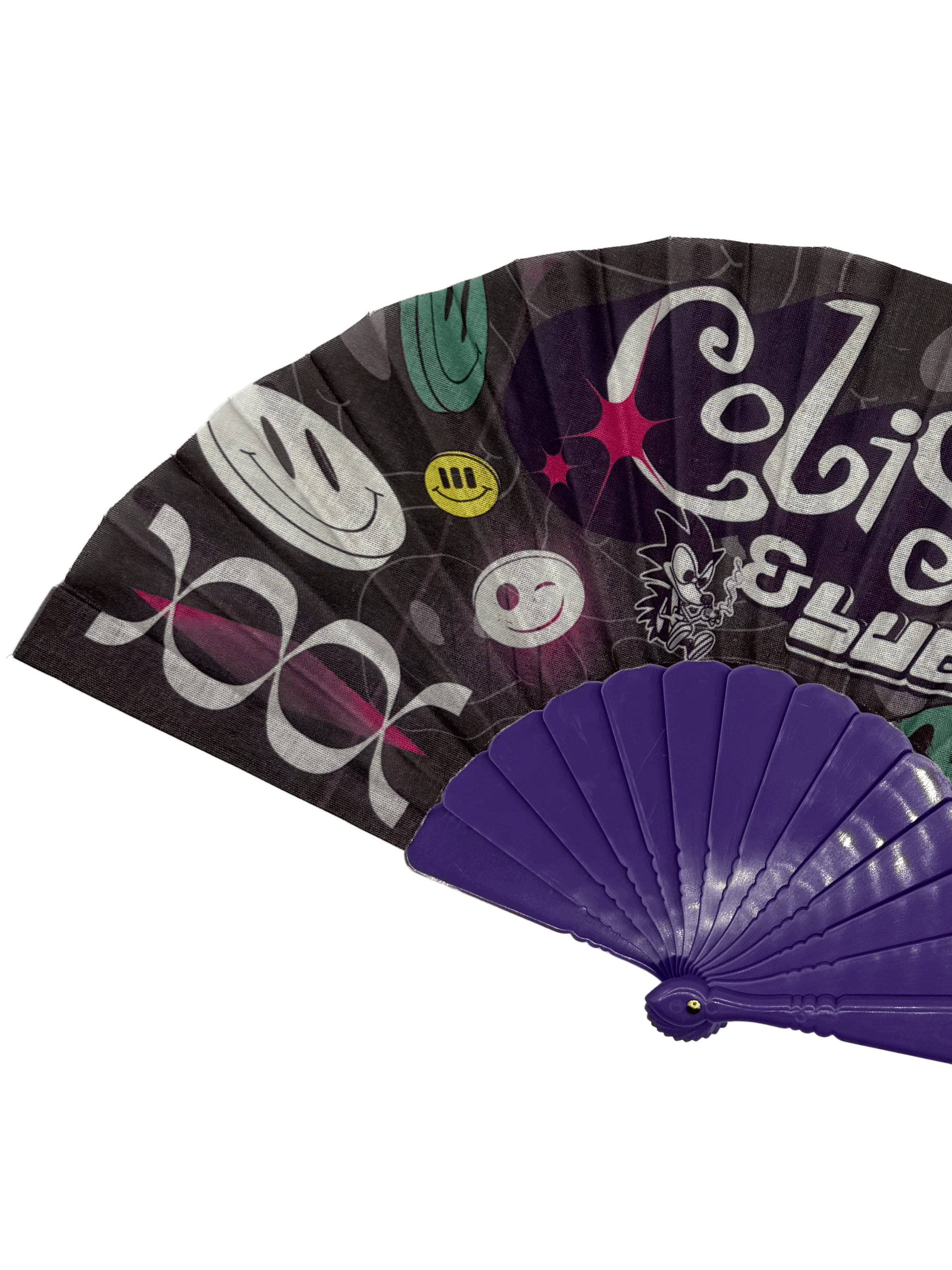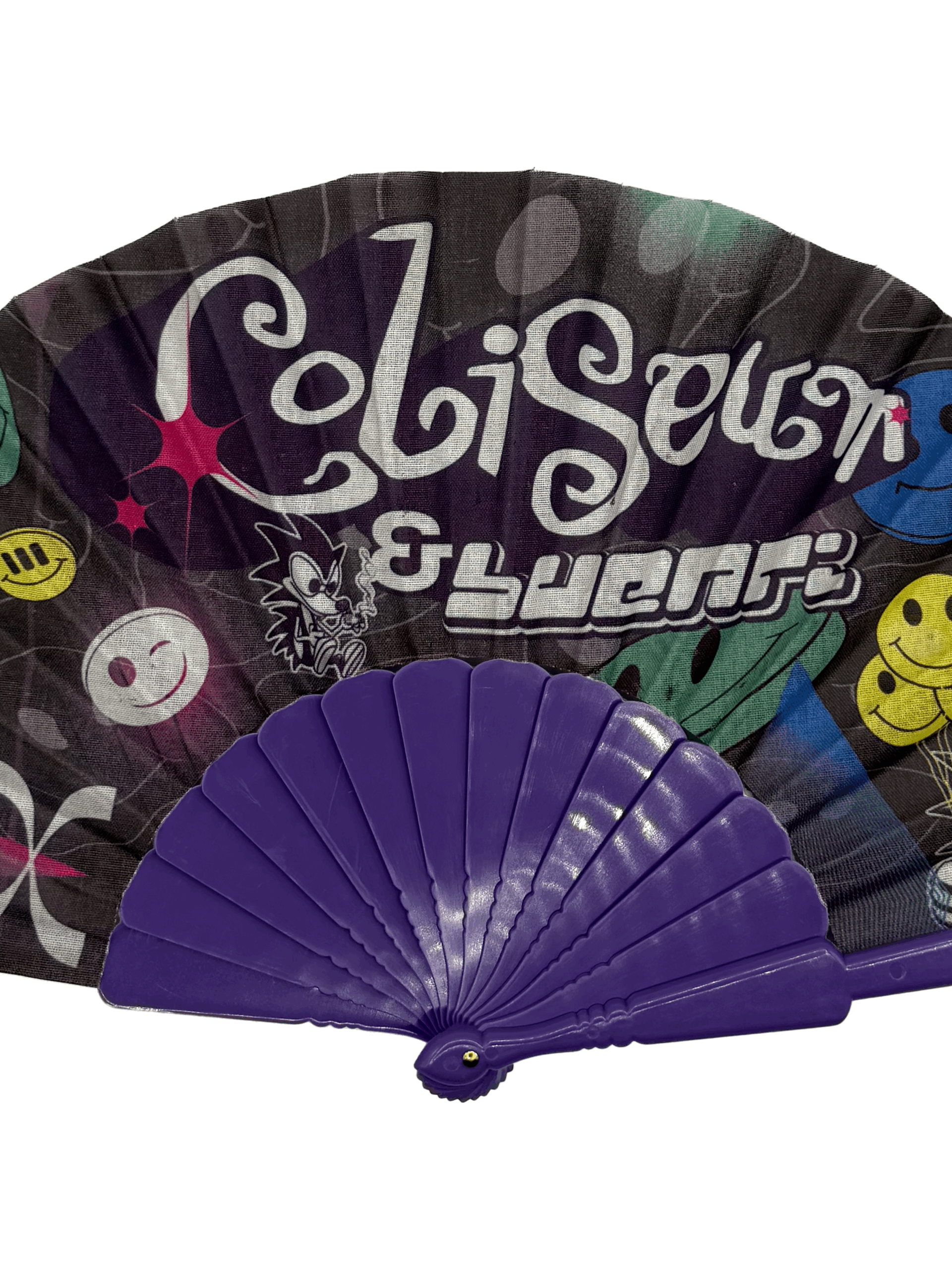 Abanico con motivo de la fiesta Buenri, We are Coliseum. Disponible con la varilla en 4 colores diferentes. (Negra, morada, gris y blanco).