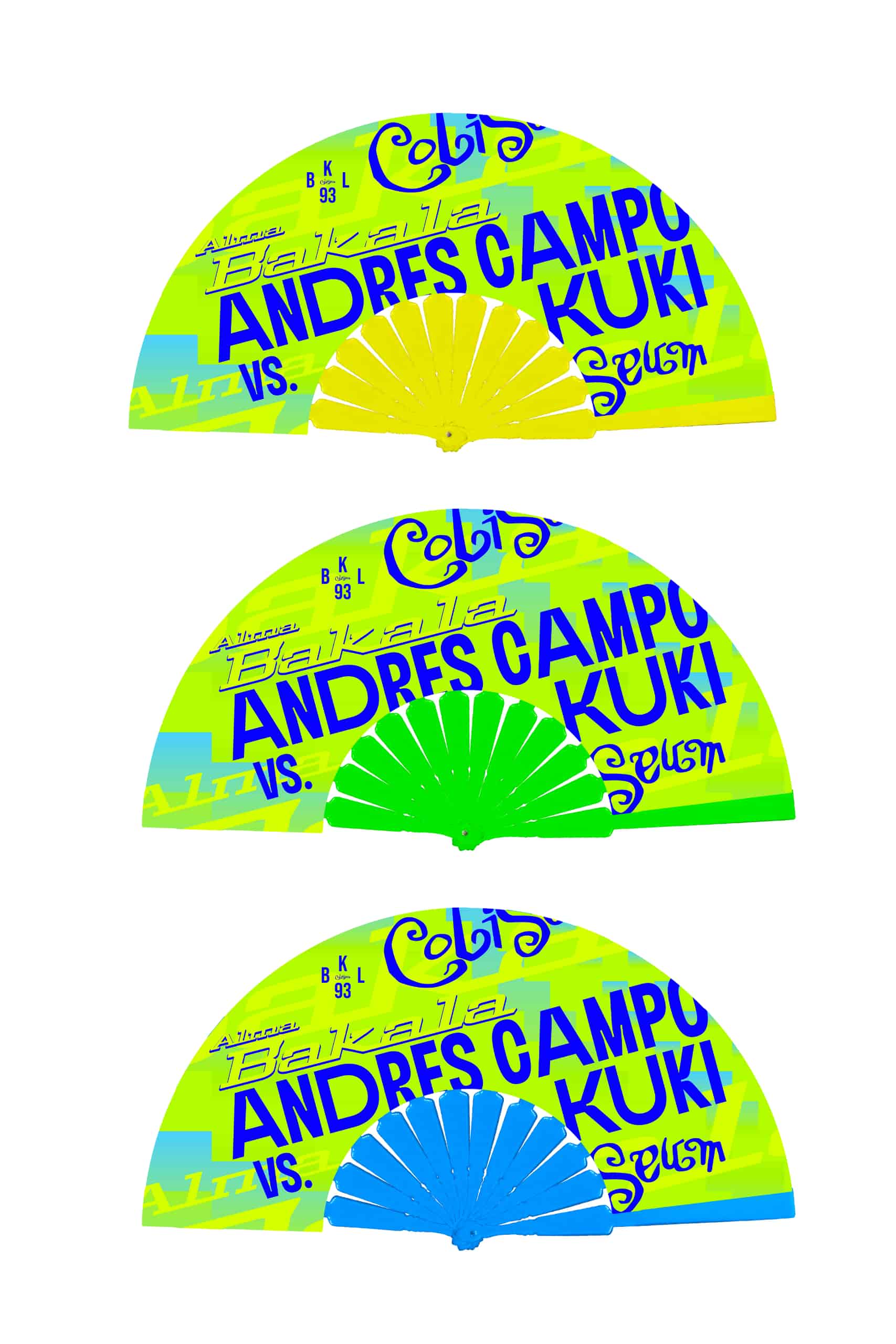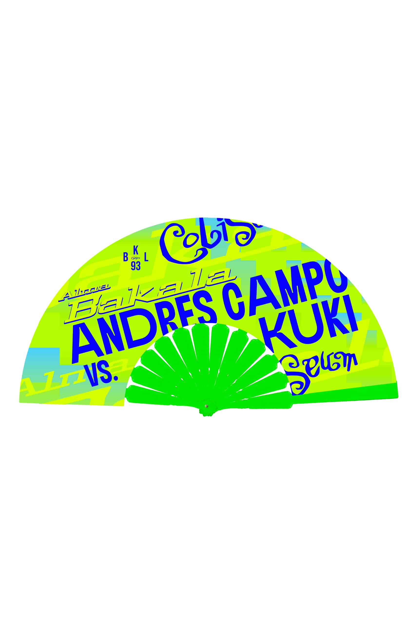 Su diseño en tonos flúor verdes y azules destaca bajo las luces. Disponible con tres varillajes diferentes: amarillo, verde o azul. Incorpora el nombre de la fiesta y los logos oficiales. Un imprescindible para los seguidores de Andrés Campo vs Kuki y para todos los que saben que la fiesta no se vive igual sin un buen abanico.