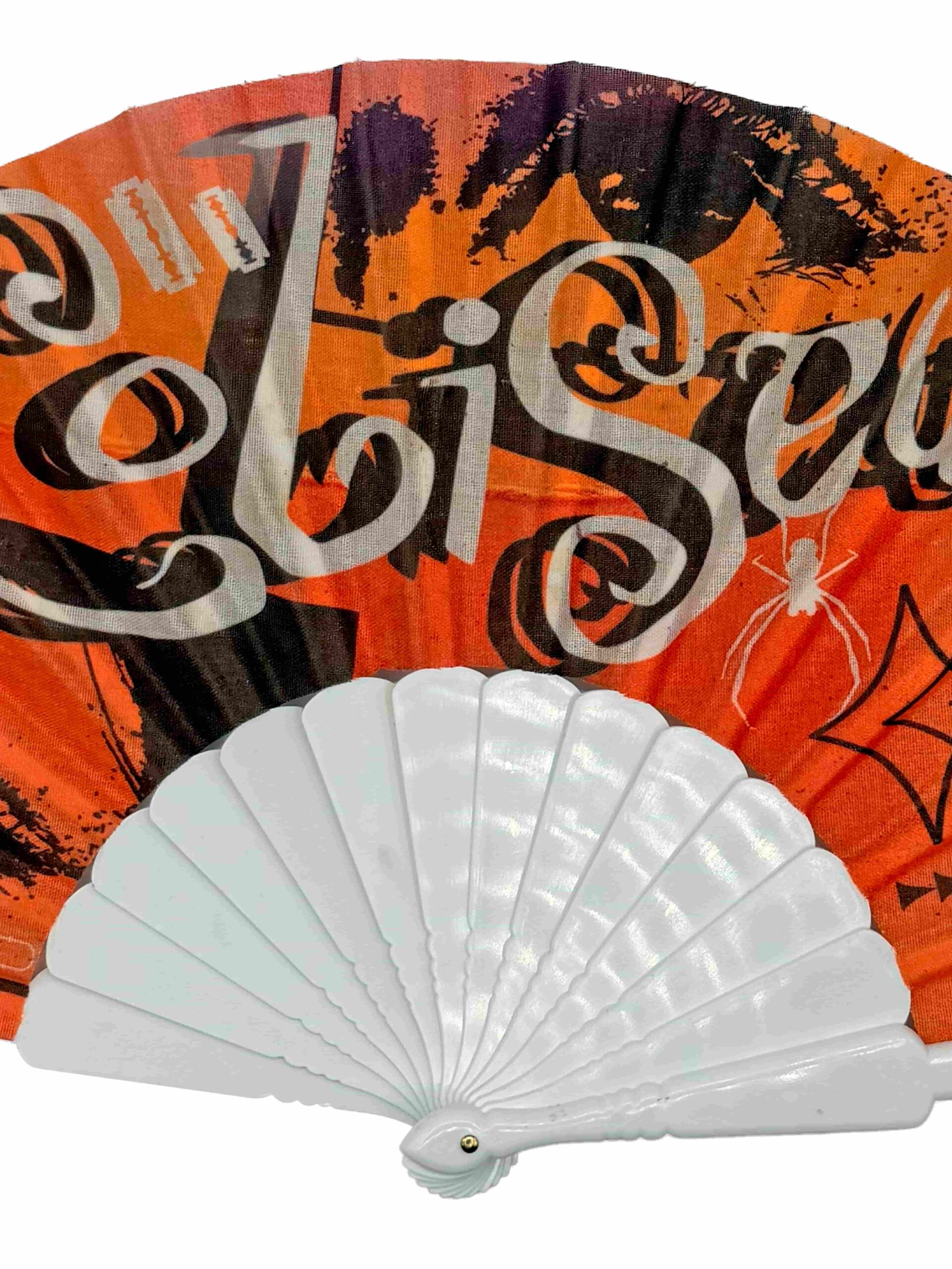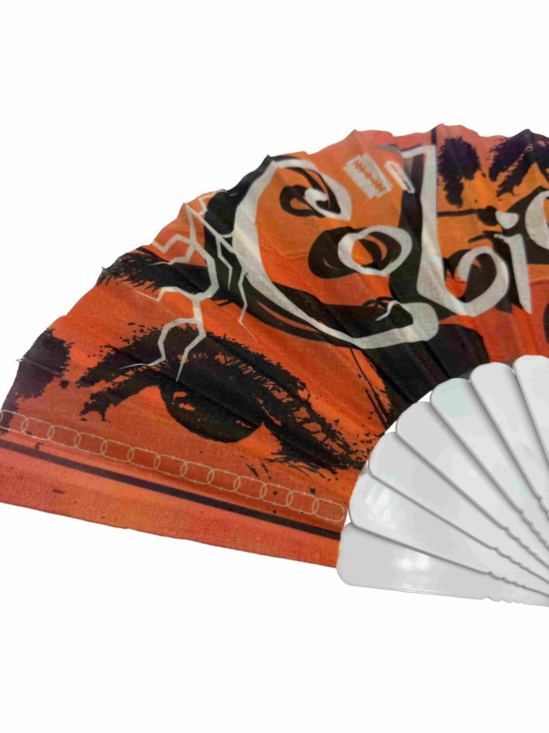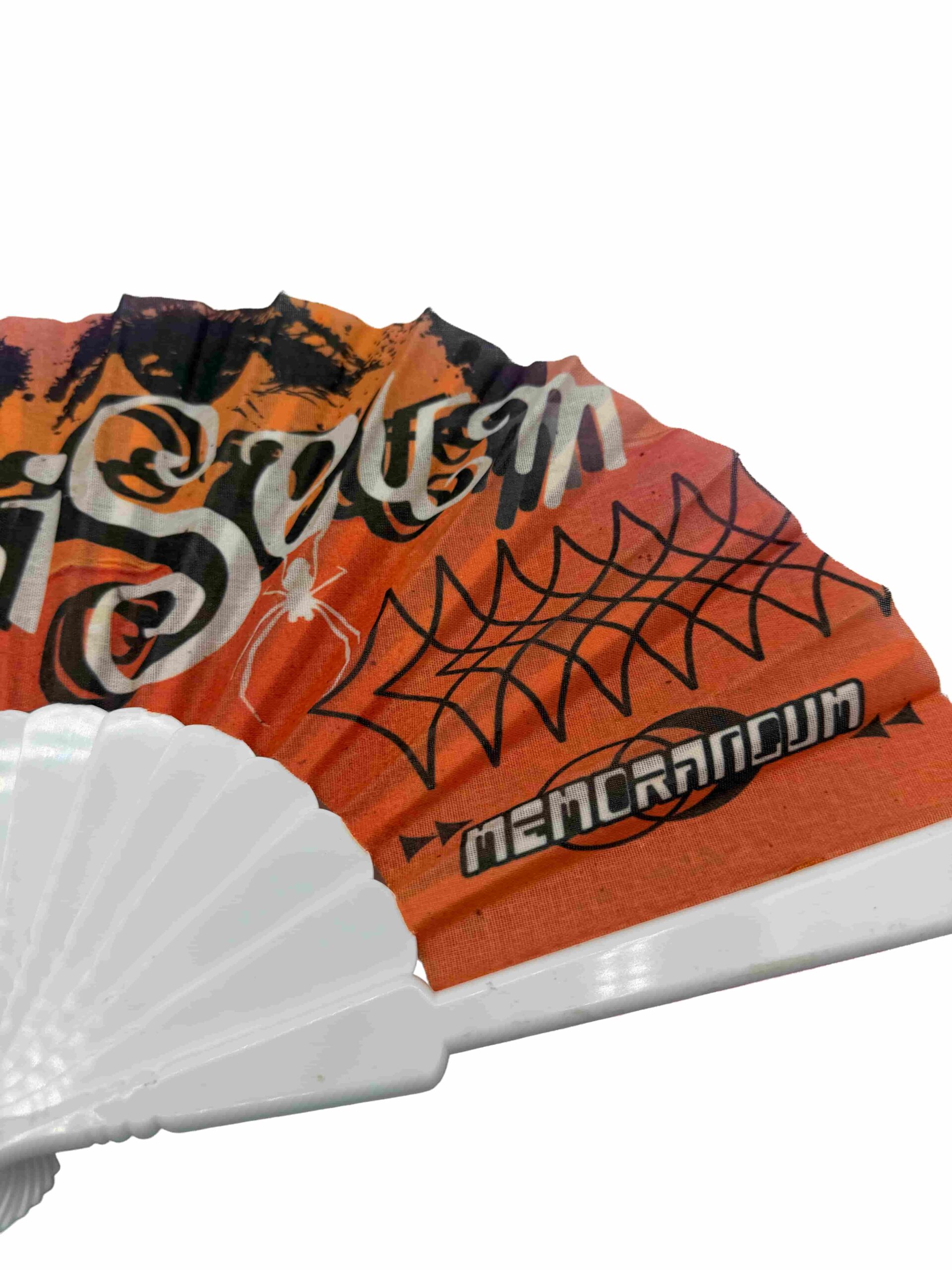 Abanico que  representa nuestra etapa musical conocida como MEMORANDUM. Varillaje disponible en blanco, negro o naranja.