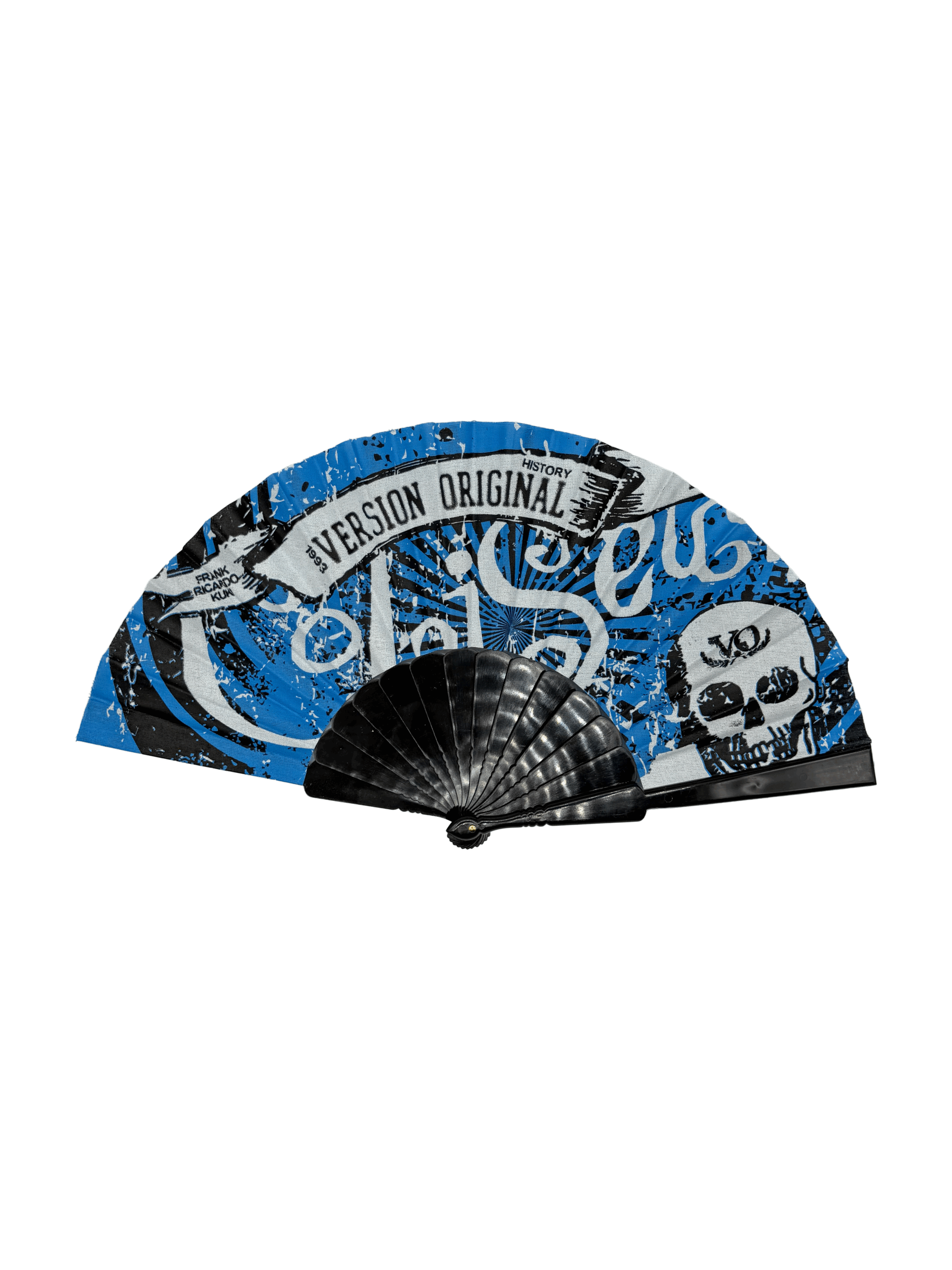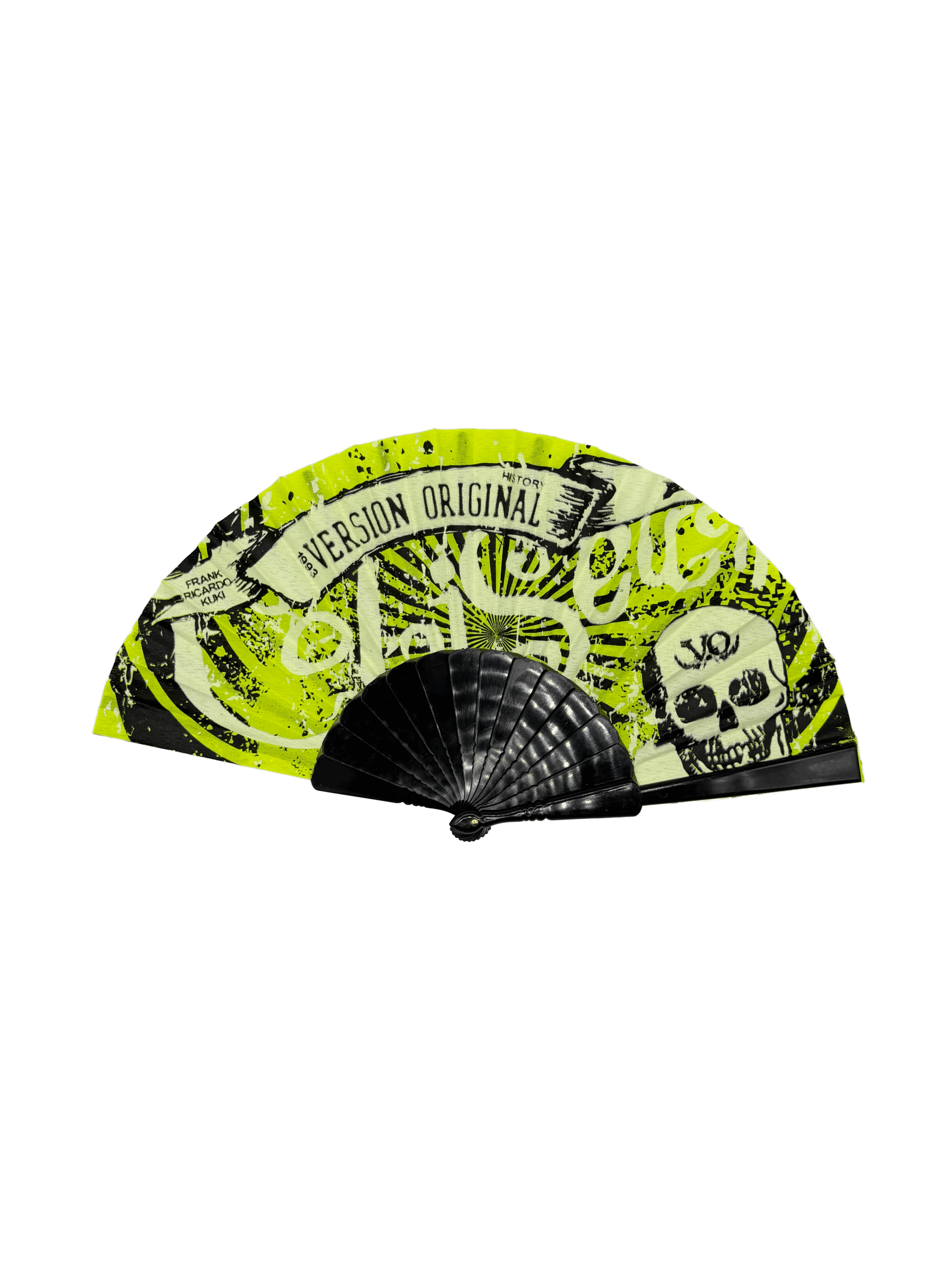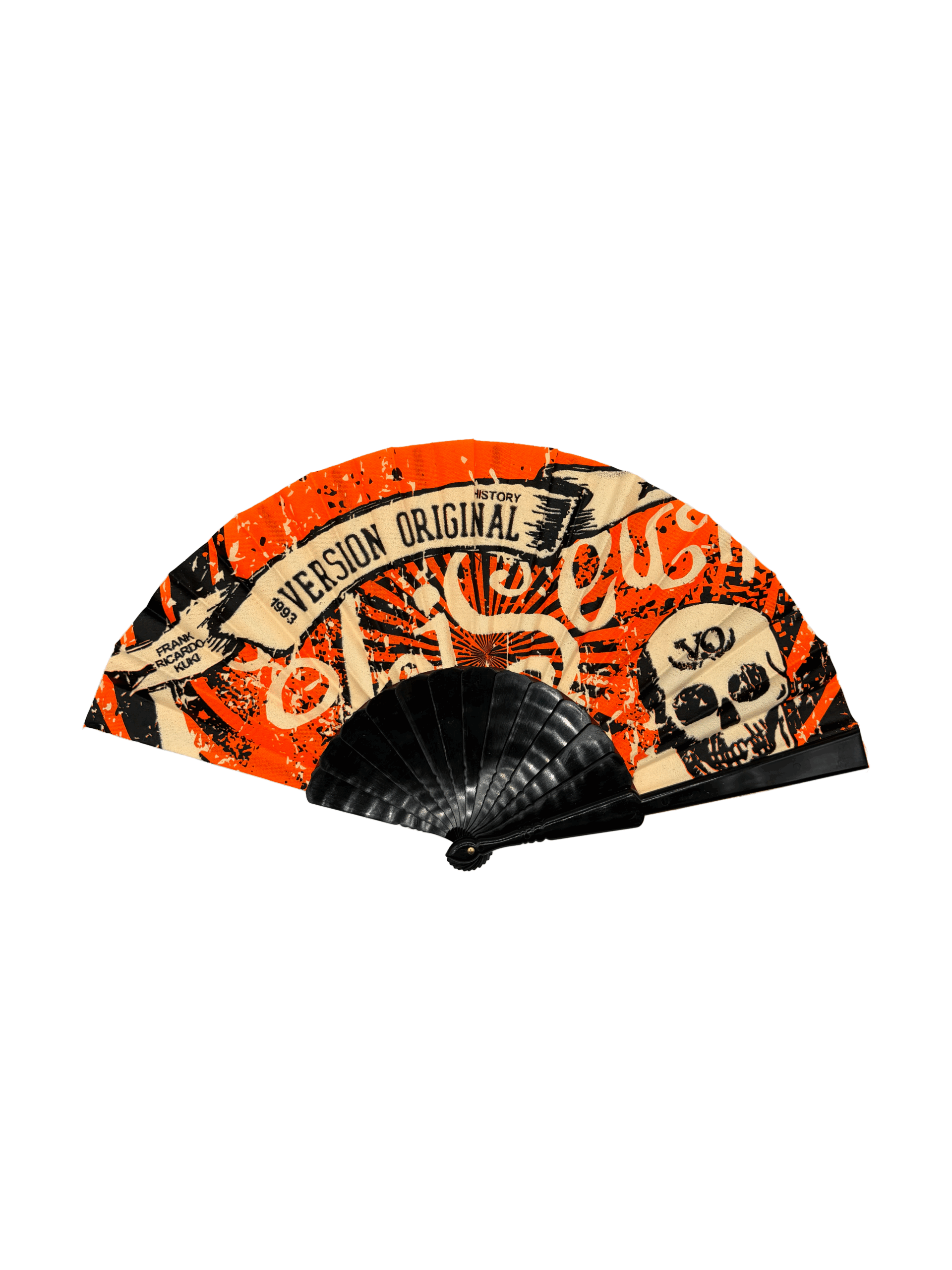 Abanicos versión original Coliseum con varilla en negro y serigrafia a dos tintas (blanca y negra). Dibujo de calavera junto a el logo de las letras de Coliseum, tiene detalles en negro y blanco y hace mención a los deejays Frank, Ricardo y Kuki. Disponible en varios colores como naranja fosforito, rosa fosforito, verde fosforito y azul fosforito.