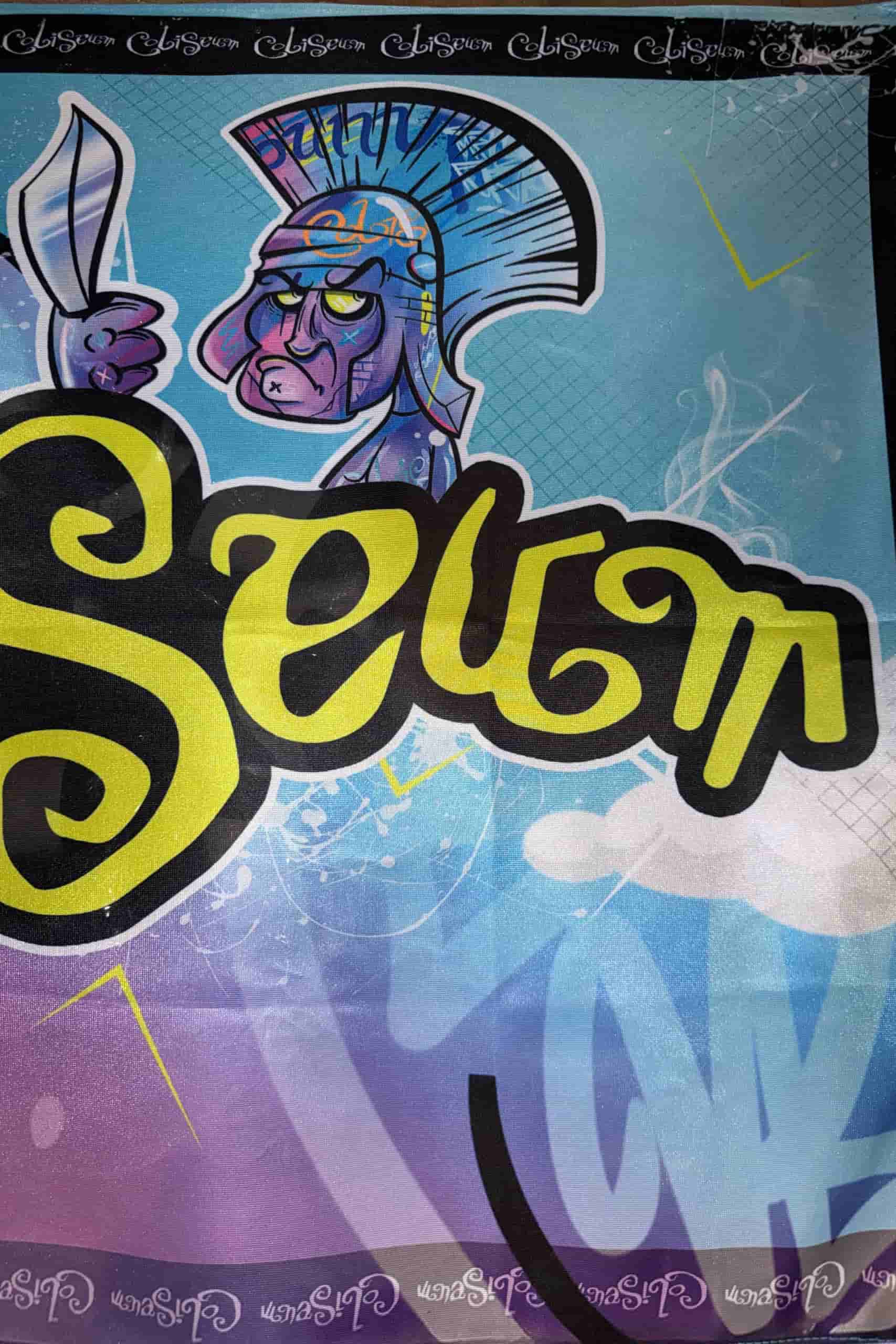 Bandera by Caras Raras diseño en tonos azules inspirado en los elementos del grafiti pintado en la discoteca Coliseum.