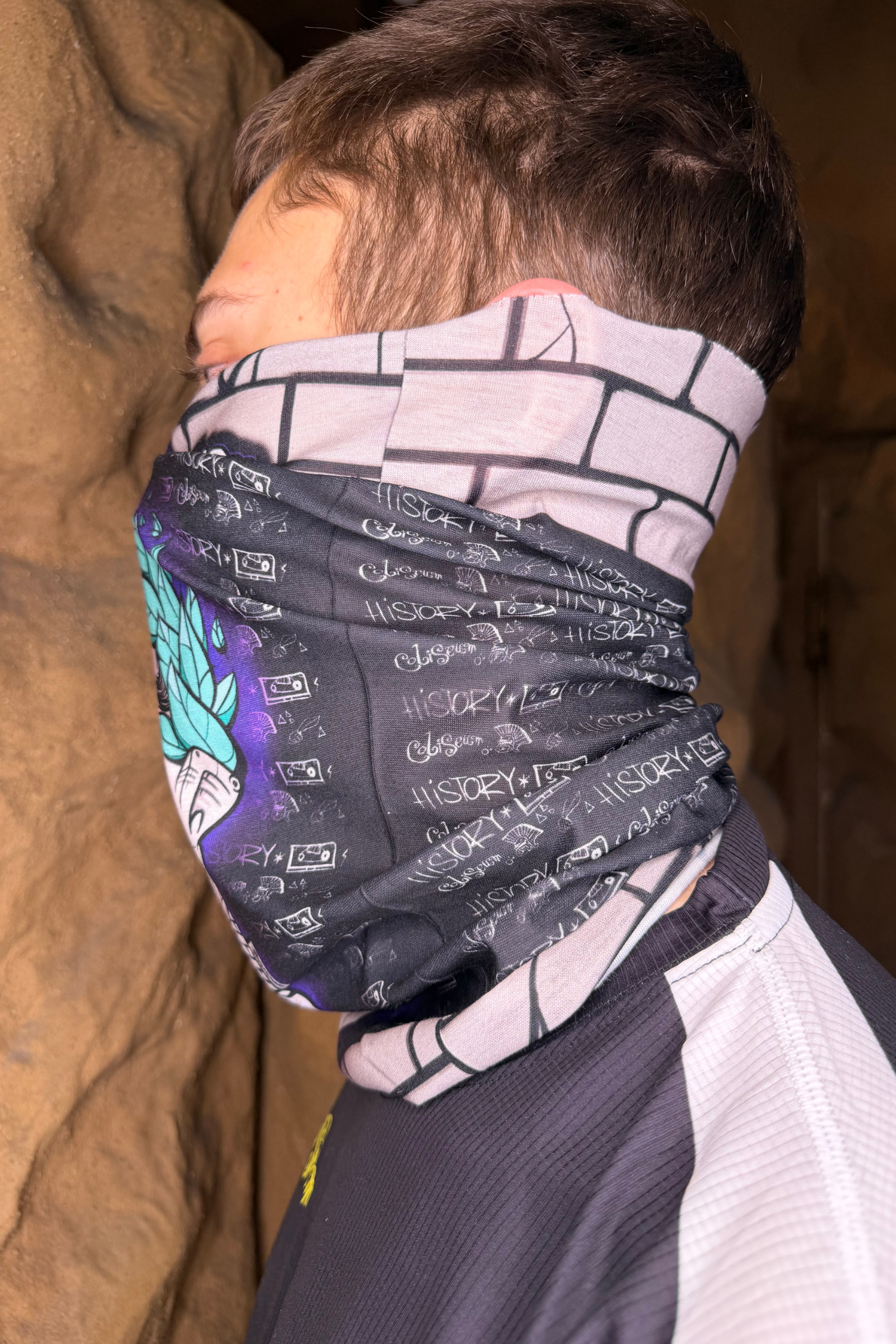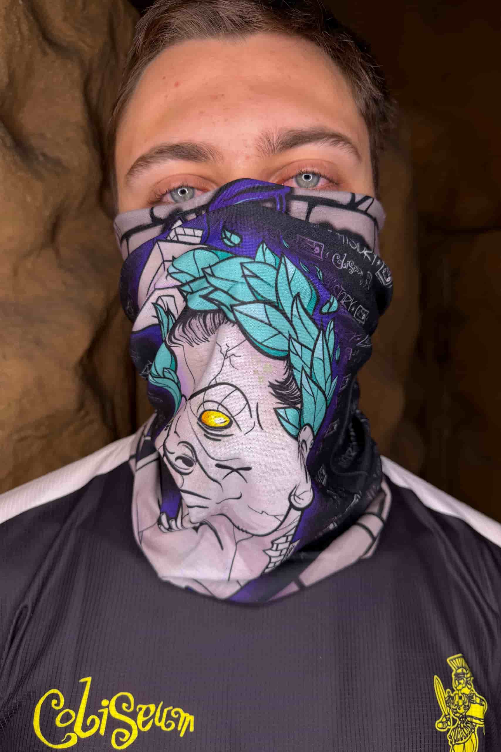 Buff de cuello con diseño exclusivo del icónico romano de Coliseum sobre fondo oscuro, acompañado del logotipo en letras blancas.