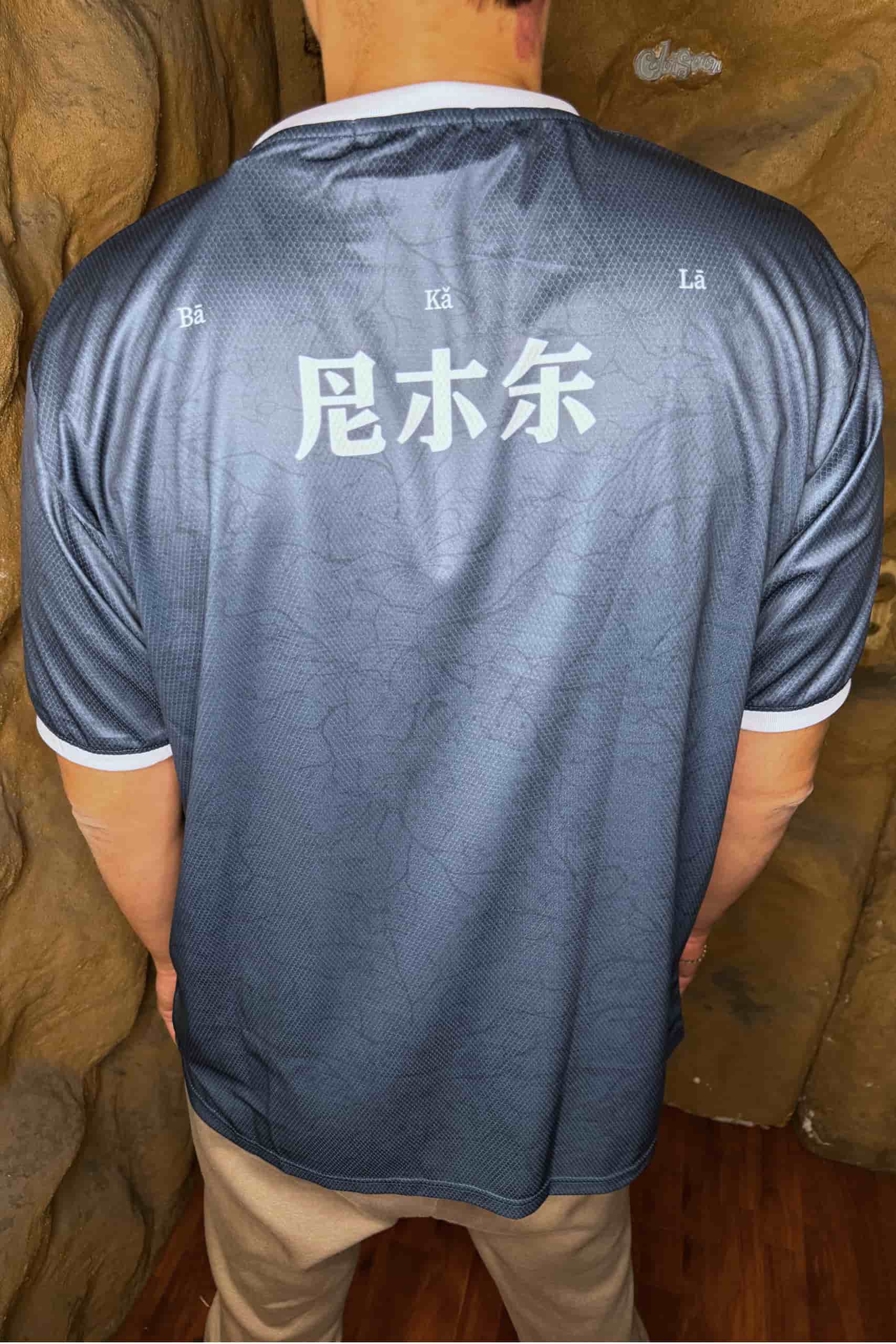 Diseñada con un acabado oscuro y textura sutil, destaca por su gráfica frontal con tipografía asiática y detalles característicos de la colección, junto al emblemático sello que refuerza su identidad. En la parte trasera, el diseño continúa manteniendo una línea limpia y contundente.