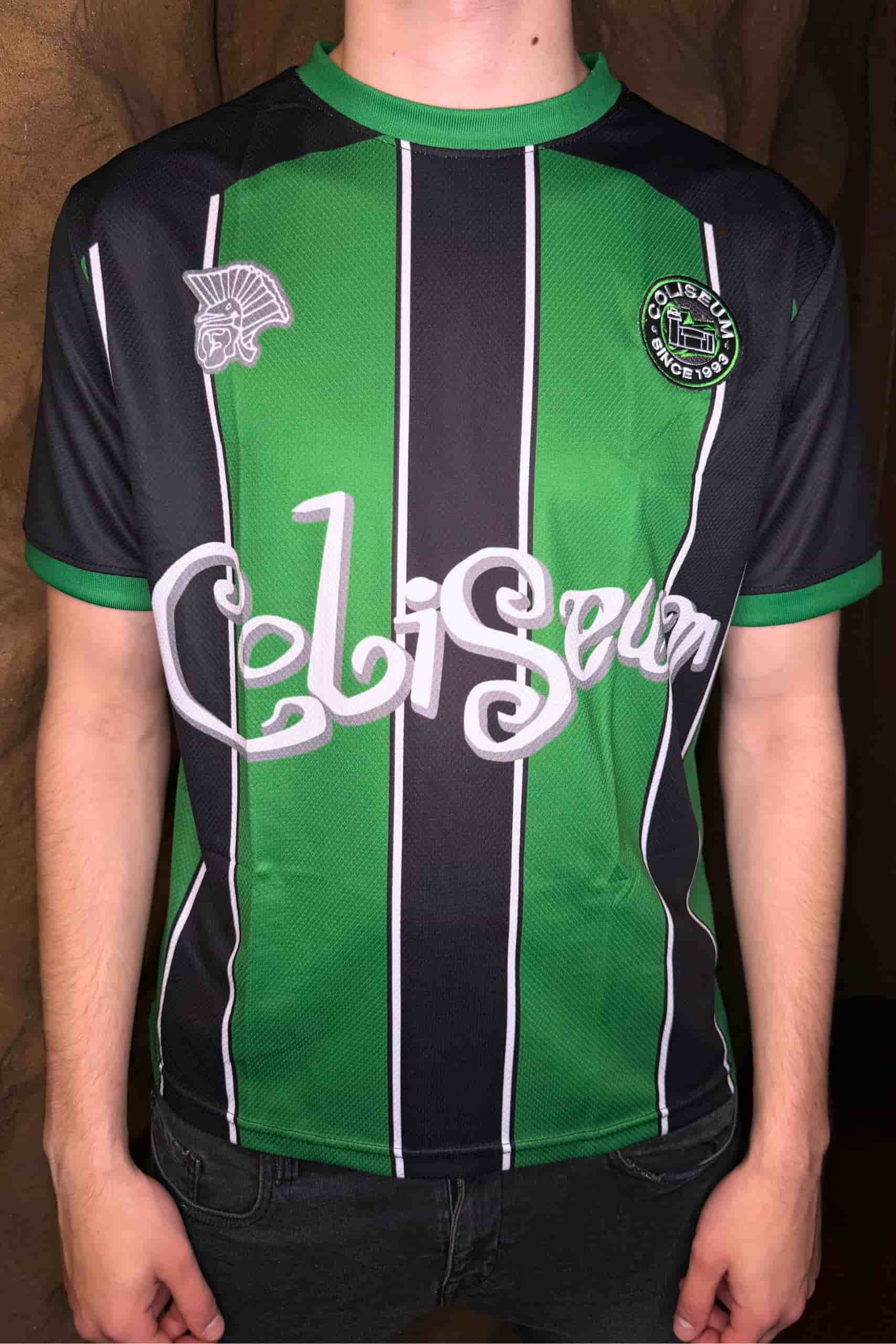 Camiseta Fútbol Coliseum con diseño en negro y verde con líneas verticales y corte oversize.