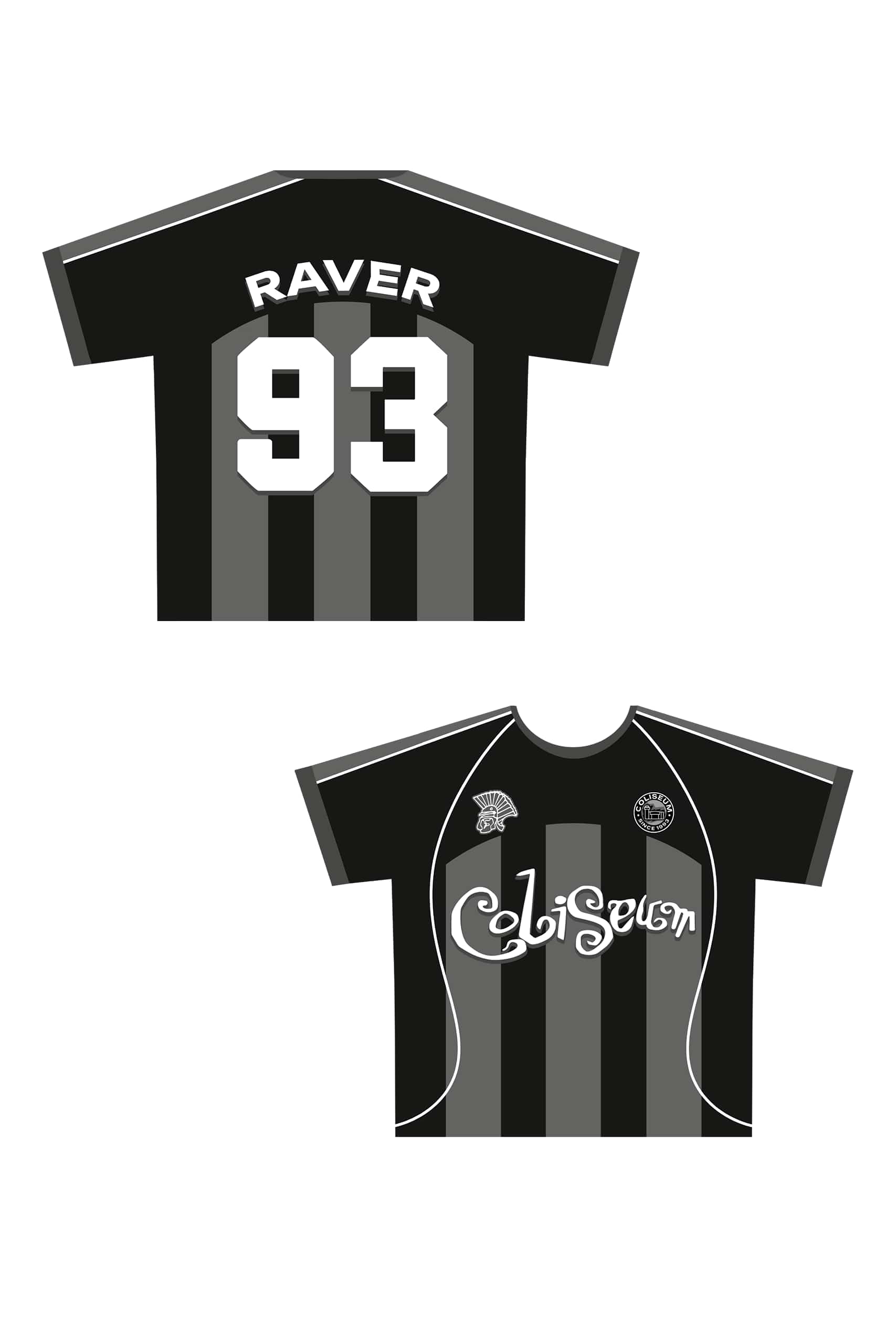 Logo Coliseum en el pecho, el escudo bordado y logo de la cabeza romano. En la espalda, el dorsal 93 junto al nombre RAVER.