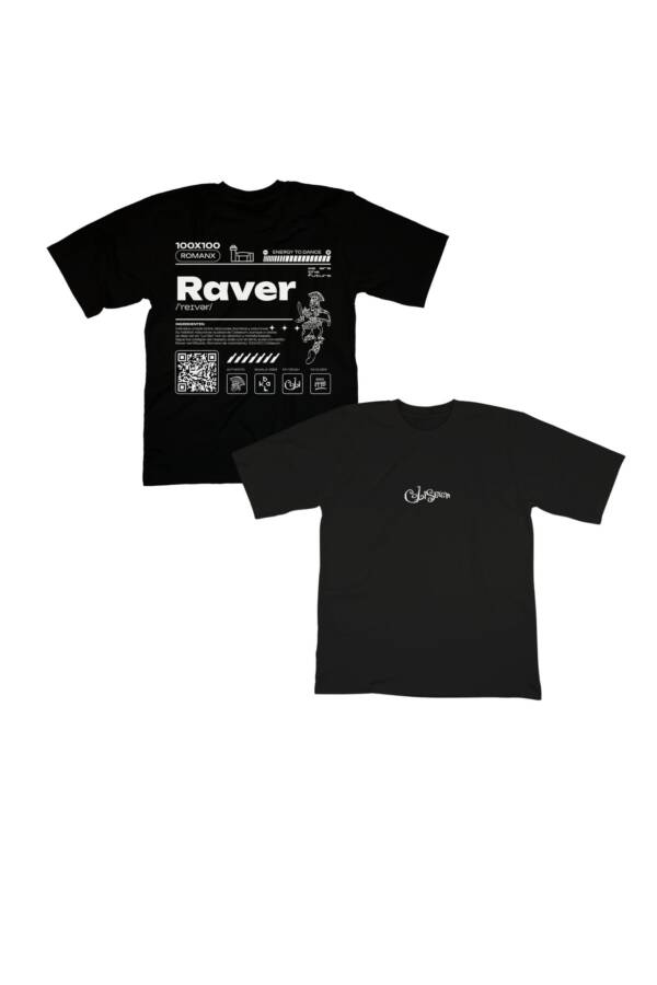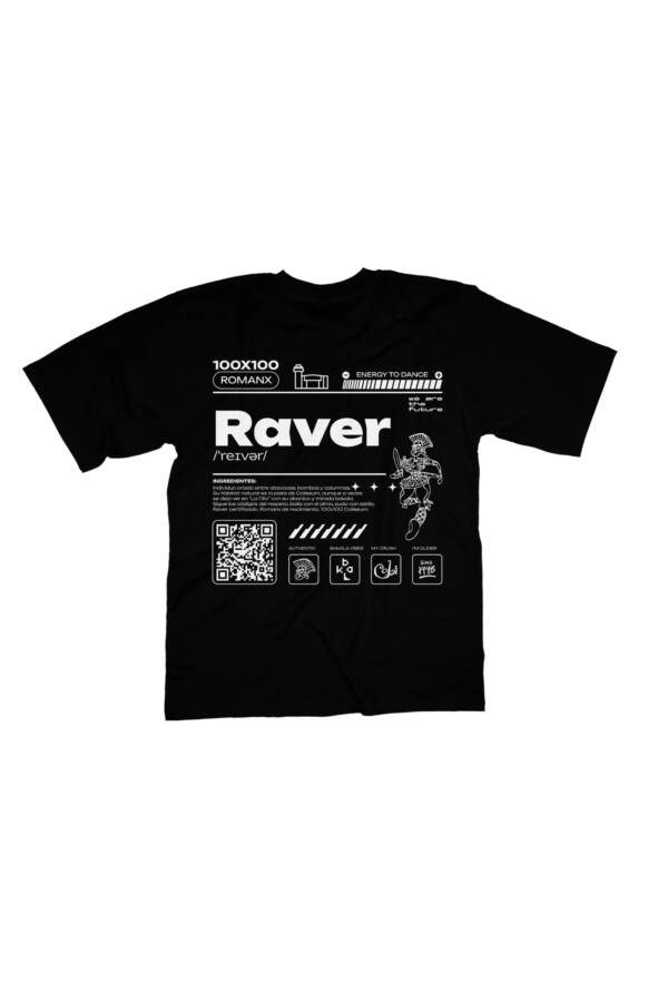 La camiseta Raver llega para los que sienten el ritmo y no paran de bailar. Diseñada en color negro intenso, combina un frontal minimalista con el logotipo Coliseum y una espalda llena de detalles gráficos, símbolos rave y mensajes que capturan la esencia del movimiento underground.