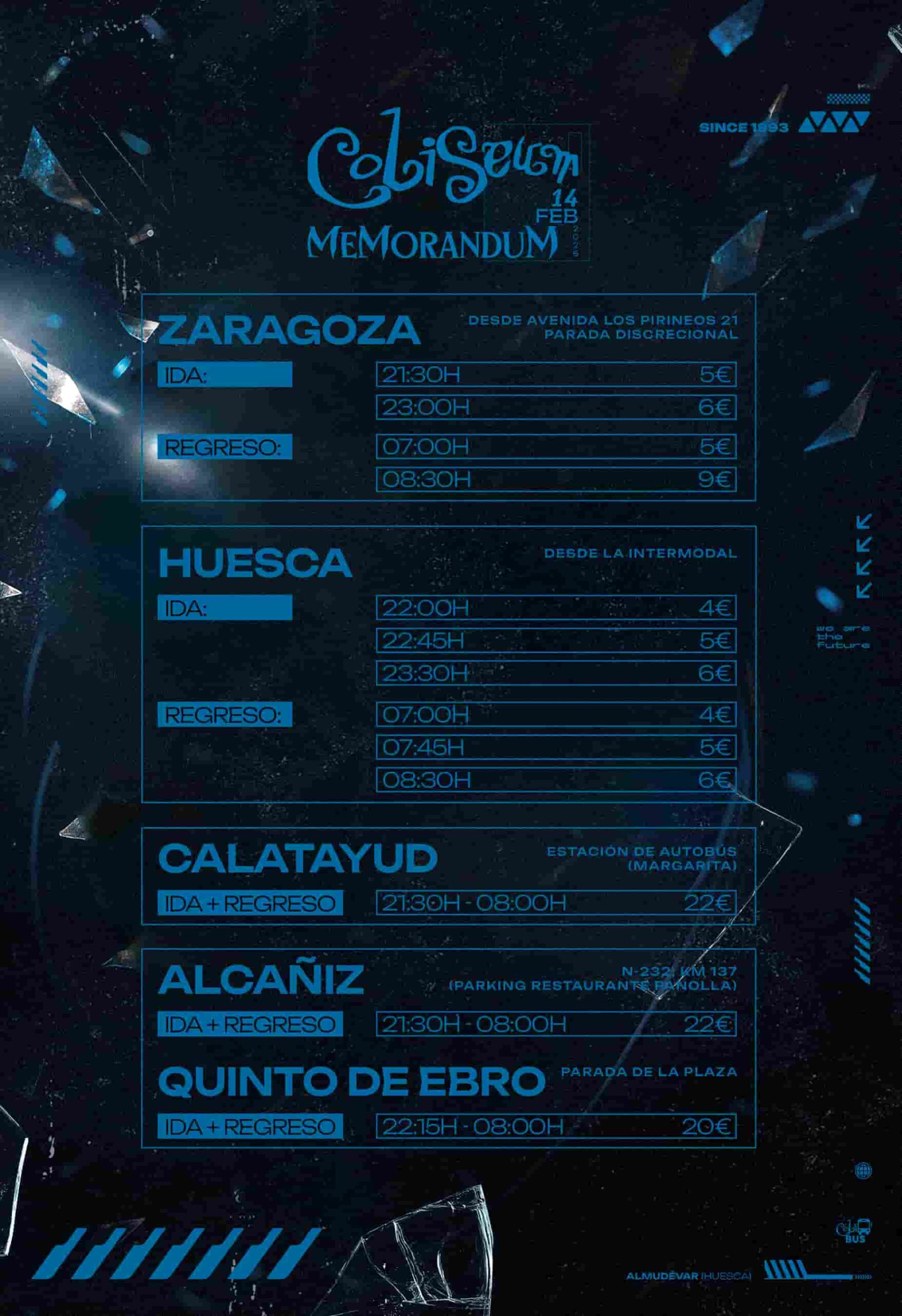Autobús dirección Coliseum con salida desde Alcañiz parking restaurante La Panolla (N232, km 137).
