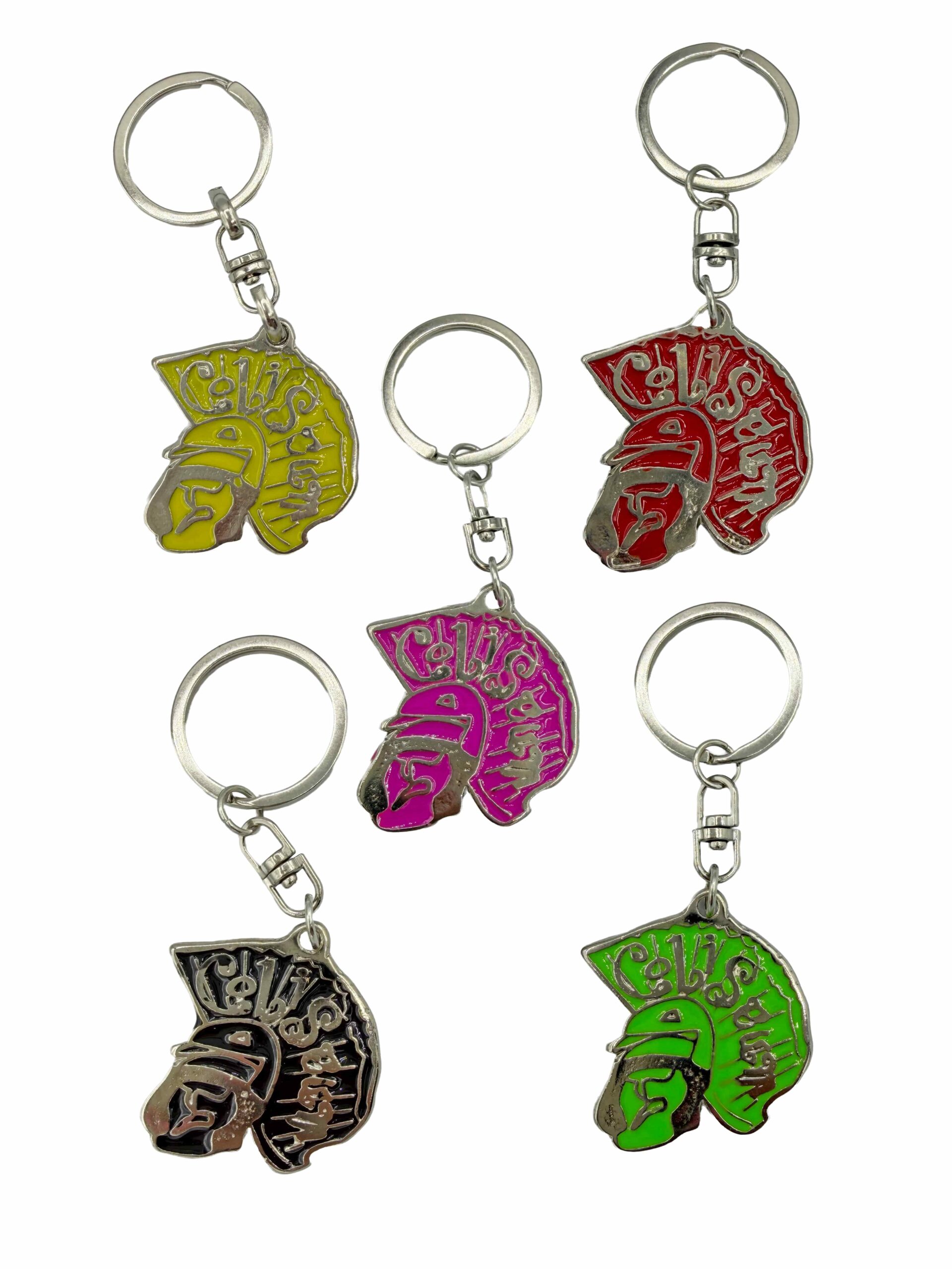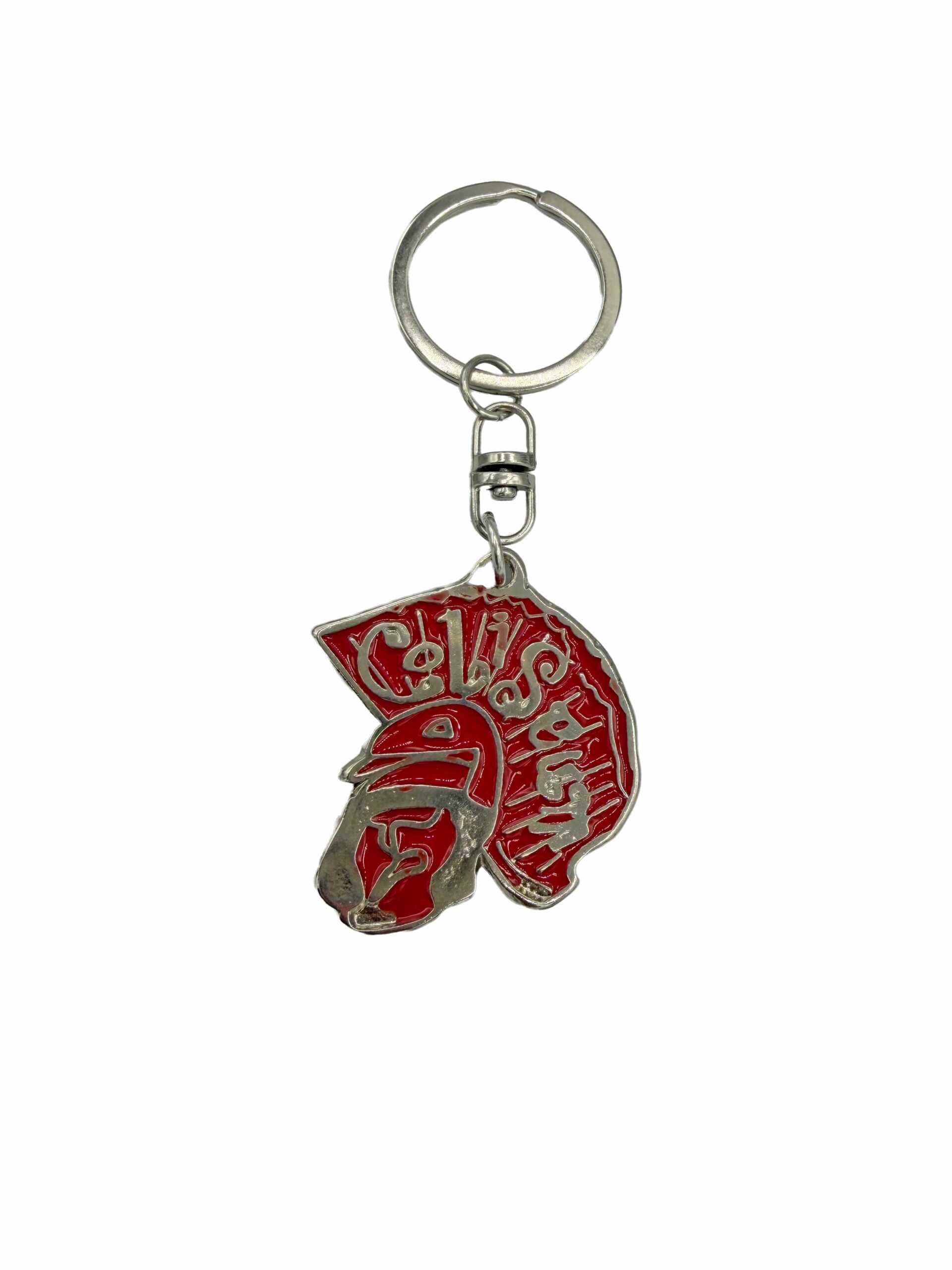 Llavero de metal con la cabeza del romano de Coliseum y las letras. El dibujo y el color esta en ambas caras; es reversible. Disponible en varios colores.