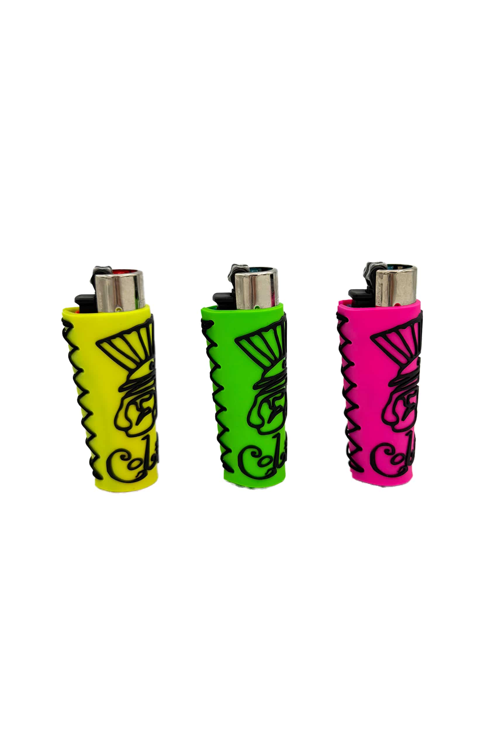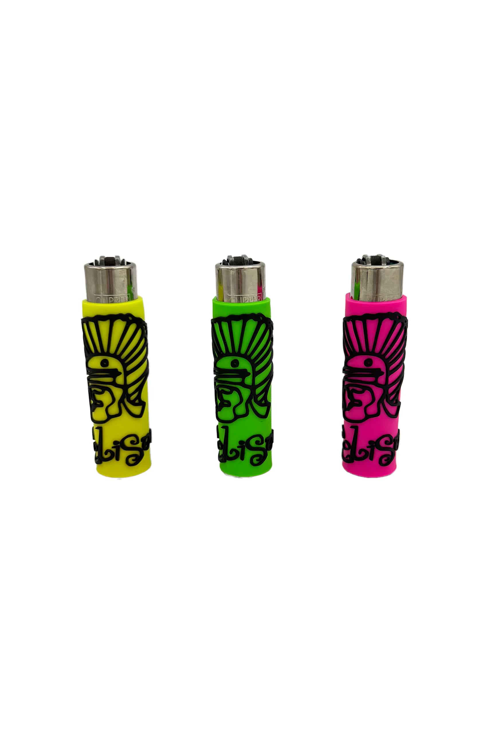 Mechero Clipper con diferentes fundas de silicona / goma de Coliseum que incluye la cabeza del romano y las clásicas letras de nuestro logotipo. Disponible en blanco, rosa o amarillo.